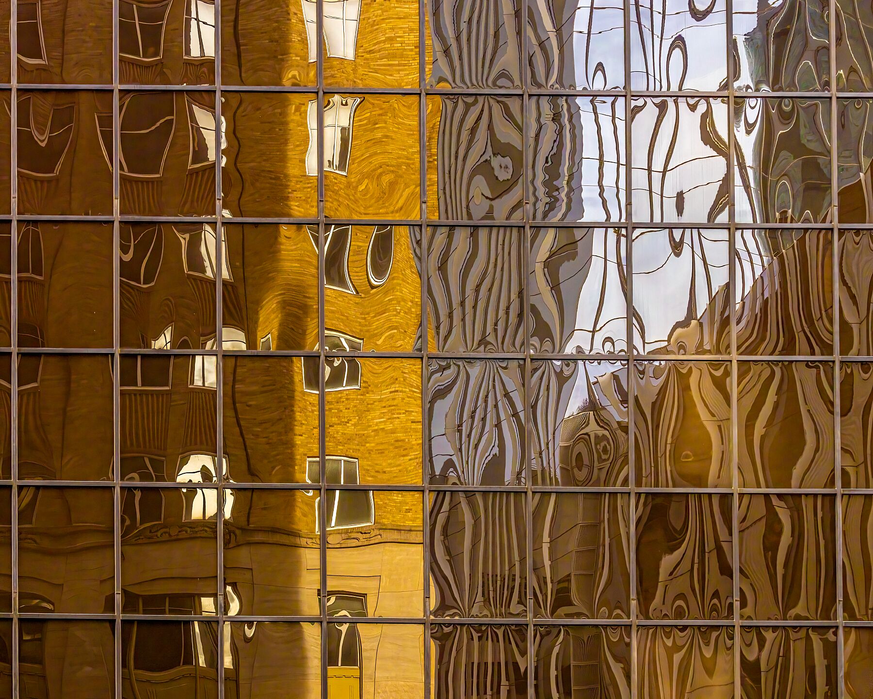 Reminiscent of the golden tones of sunlit wheat, corn or rye at harvest time, this image also emulates the breeze tossing the stalks about, with its wavy lines, while the rhomboid forms of windows remind us that we are in a city.