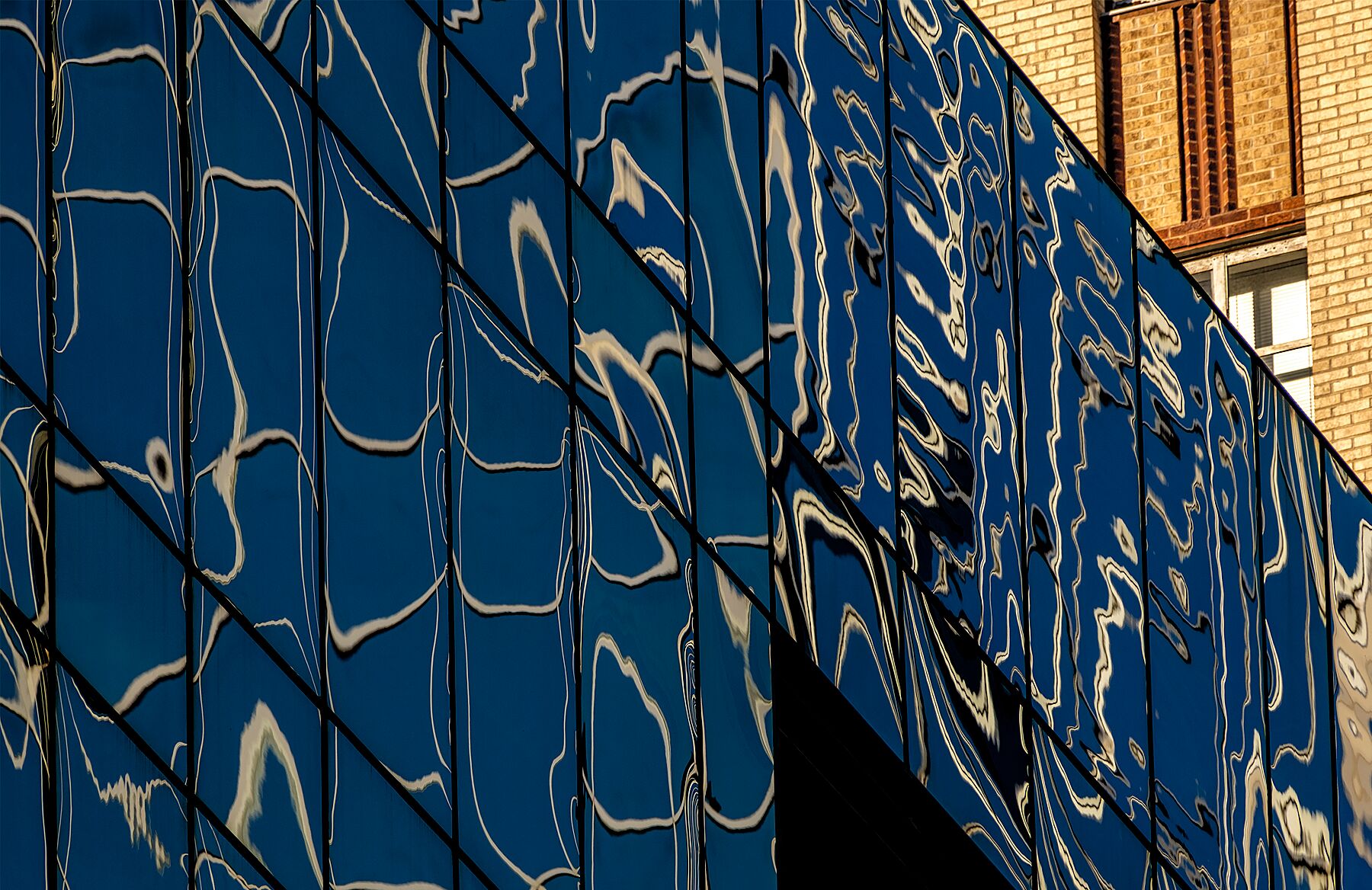 This art print juxtaposes the old and the new, as irreverent and joyous wavy reflections confront the rigid, textured surface of institutional yellow brick and shuttered windows.