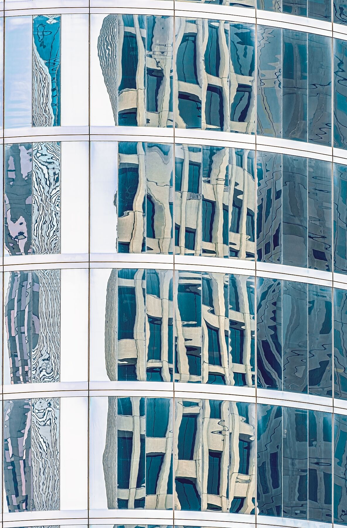 While neighboring buildings are reflected in a variety of hues and design forms in this curved glass surface, what stands out to me is the central cellular structure, reminiscent of a honeycomb.