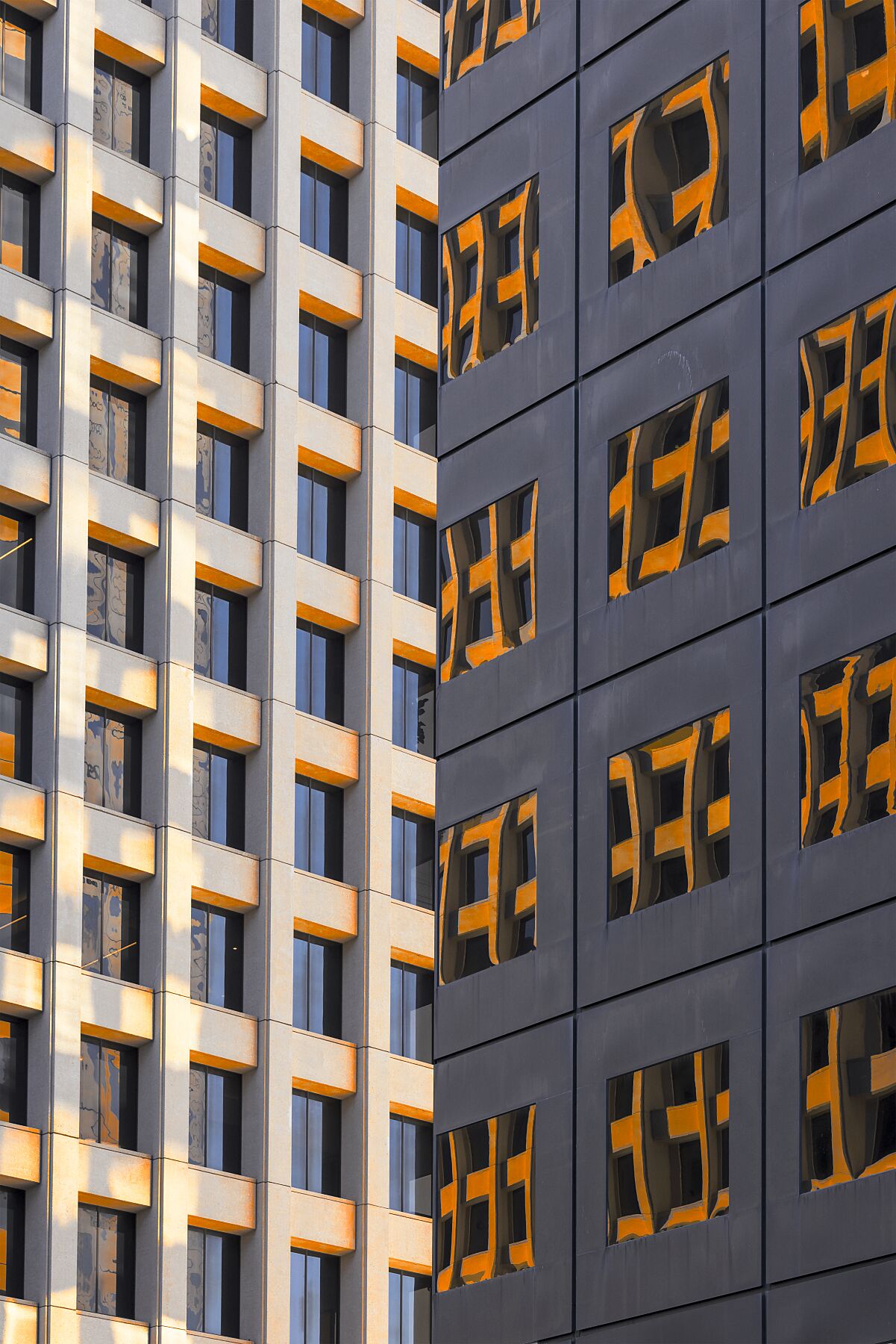 The fiery light of sunset illuminates the windows or eyes of these buildings, suggesting an intense, passionate and enduring love.