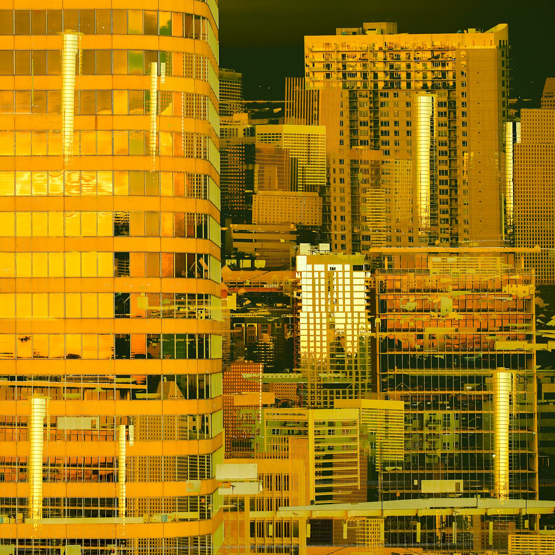 The pulsating energy of the city is represented by the mirrored windows, while a calmer golden light welcomes the oncoming evening.